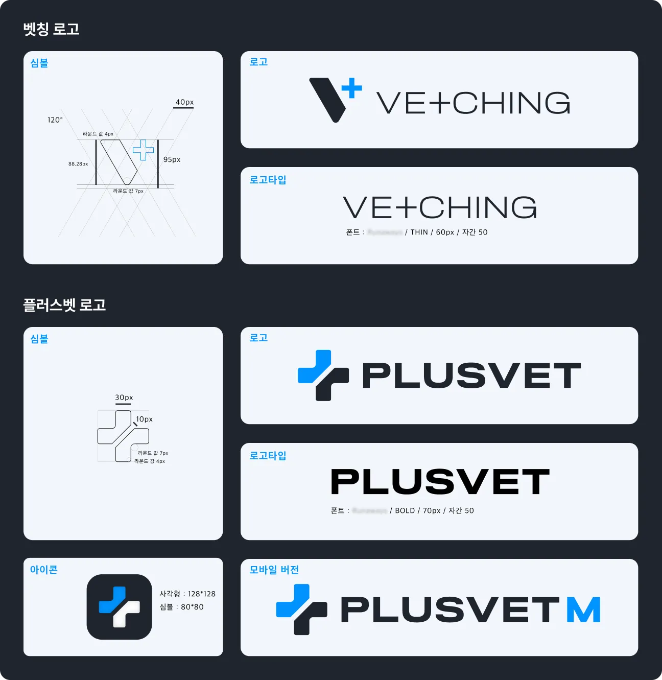 벳칭에서 개발 중인 프로덕트는 범위가 상당히 넓었고, 앞으로의 브랜드 일관성을 보장하기 위해 로고 제작 가이드를 만들게 되었습니다. 사실 엄밀히 말해 전통적인 가이드보다는 제작 과정의 기록에 더 가깝습니다. 로고의 구체적인 디자인 요소들—예를 들어, 심볼의 크기, 각도, 라운드 값, 두께, 그리고 로고타입을 위한 폰트 설정을 상세하게 기록함으로써, 앞으로 만들어갈 프로덕트 디자인를 위해 일관된 기준을 만들어주려고 한 것입니다. 이 가이드는 이미 약 5개의 하위 프로덕트 로고 제작에 활용되었으며, 일관된 스타일의 로고를 만들어내는데 도움이 되었습니다.